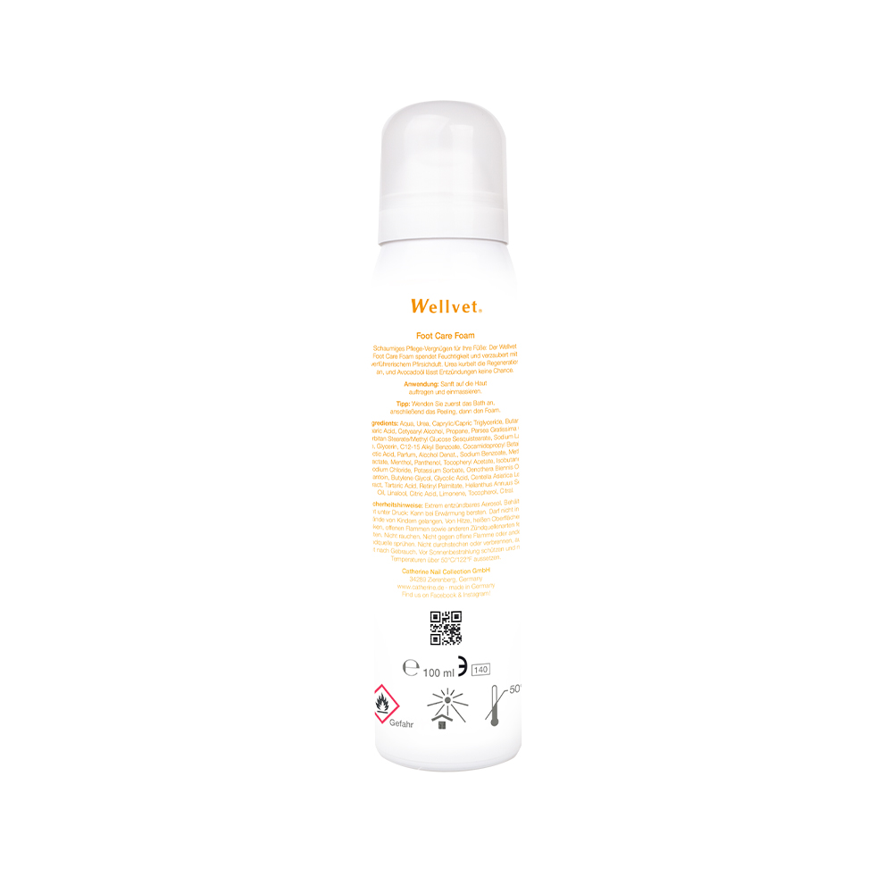 Moisturising foam. Penové potešení z péce o vaše nohy: Wellvet Foot Care Foam okouzlí svudnou broskvovou vuní. Použití: Jemne naneste na pokožku a vmasírujte. Tip: Nejprve naneste lázen, pak peeling a nakonec penu.