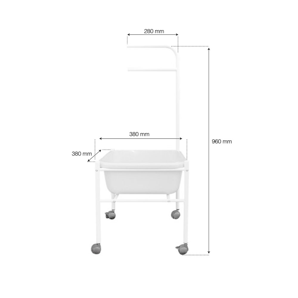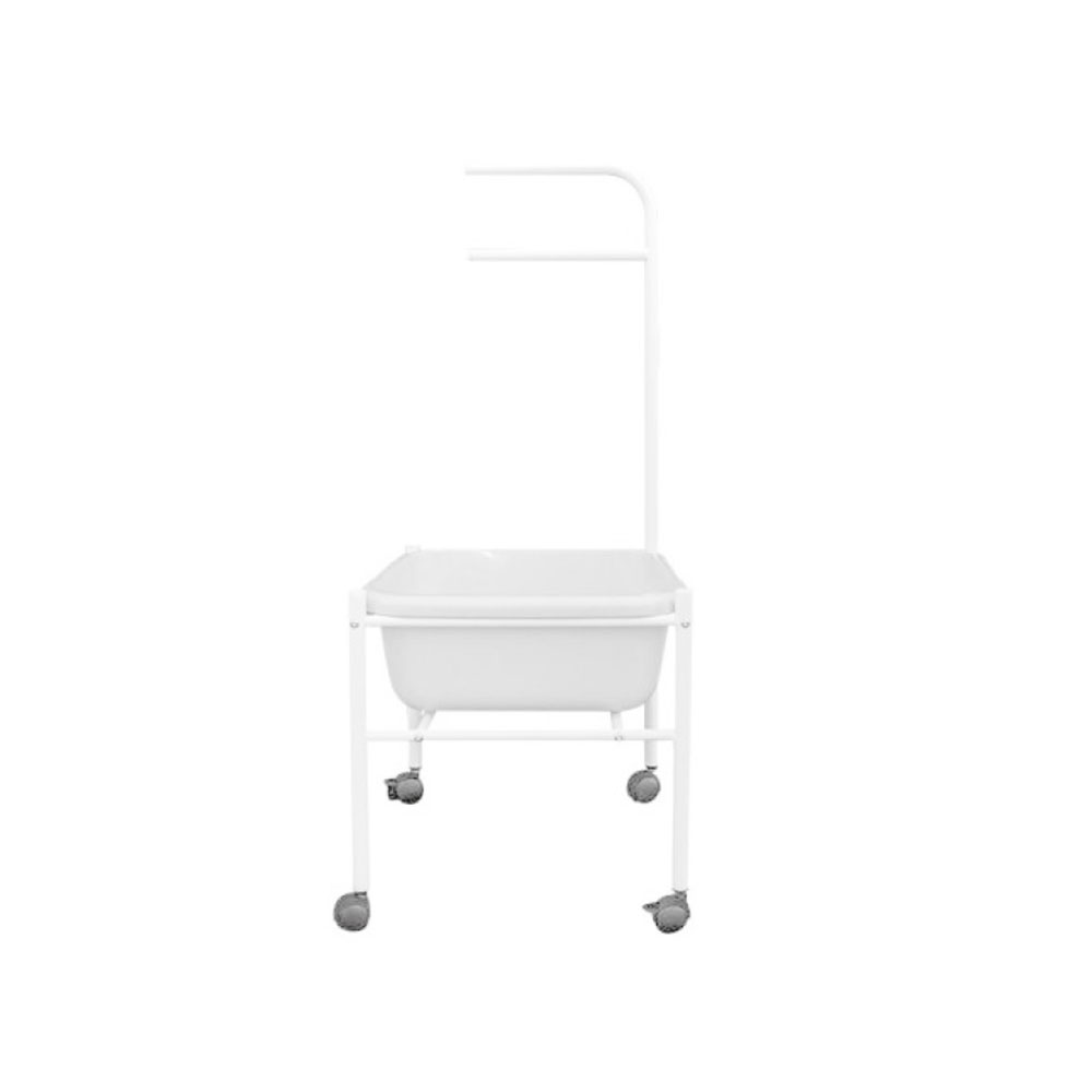 Profesionální koupel nohou. Vozík na koupel nohou s nasazenou plastovou vanickou je nepostradatelný pro profesionální péci o nohy. Vozík je stejne stabilní jako odolný proti naklonení a pomocí rukojetí jej lze snadno posouvat po studiu.