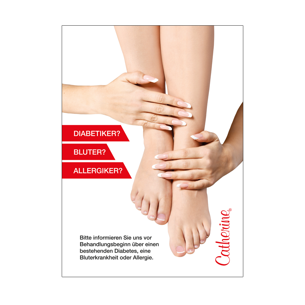 Informativní reklamní cedule. Pouze s právy na užívání (pro specializovaná a elitní studia). Zjistete ješte dnes, jak se mužete se svým studiem stát specializovaným a/nebo elitním studiem a zajistit si práva k užívání. Reklamní cedule má za cíl pripomenout a informovat vaše zákazníky, aby se s vámi poradili o všech nálezech a objasnili si správný postup pred zahájením pedikérského ošetrení. Ukažte svým zákazníkum, jak je duležité se predem presne domluvit!